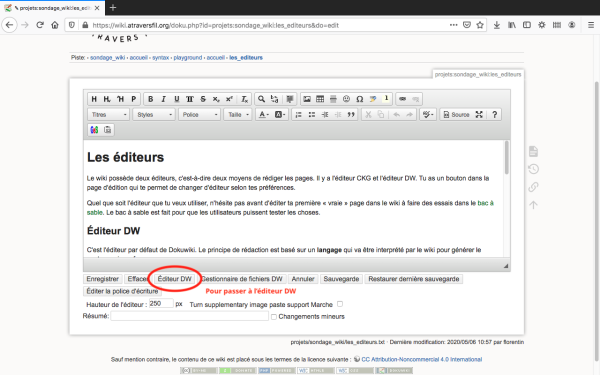 Le wiki possède deux éditeurs, c'est-à-dire deux moyens de rédiger les pages. Il y a l'éditeur CKG et l'éditeur DW. Tu as un bouton dans la page d'édition qui te permet de changer d'éditeur selon tes préférences. L'action sur ce bouton fermera la page d'édition, en vous demandant si vous voulez sauver les modifications déjà effectuées dans la page, et il faudra rouvrir la page en mode édition pour voir le changement d'éditeur.
